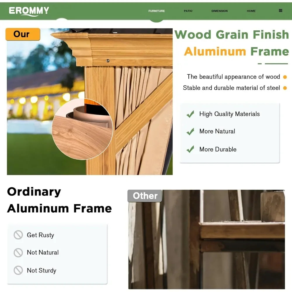 - 【Wood Grain Frame】- This outdoor gazebo features a sturdy and durable 4.8"x4.8" triangular aluminum frame with a natural wood-like appearance achieved through thermal transfer printing. This provides excellent protection against scratches, peeling, corrosion, and rust, ensuring a long service life.