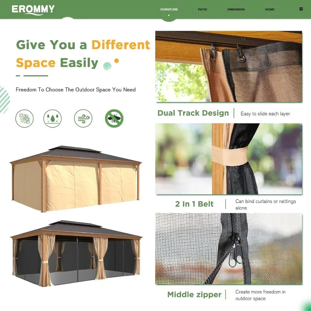 | Material | Wood-Looking Finish Aluminum Frame, Galvanized Steel Top, Yarn Dyed Polyester Curtains amd Nettings |